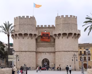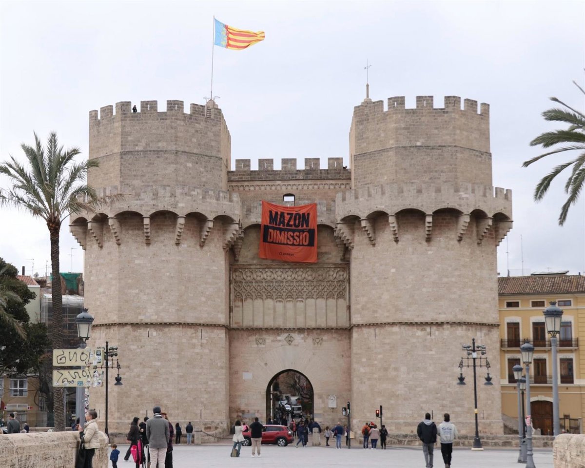 Joves PV-Compromís han colgado en la mañana de este viernes en las Torres de Serranos de València una gran pancarta --de 6x6 metros-- donde se podía leer 'Mazón dimisión'.