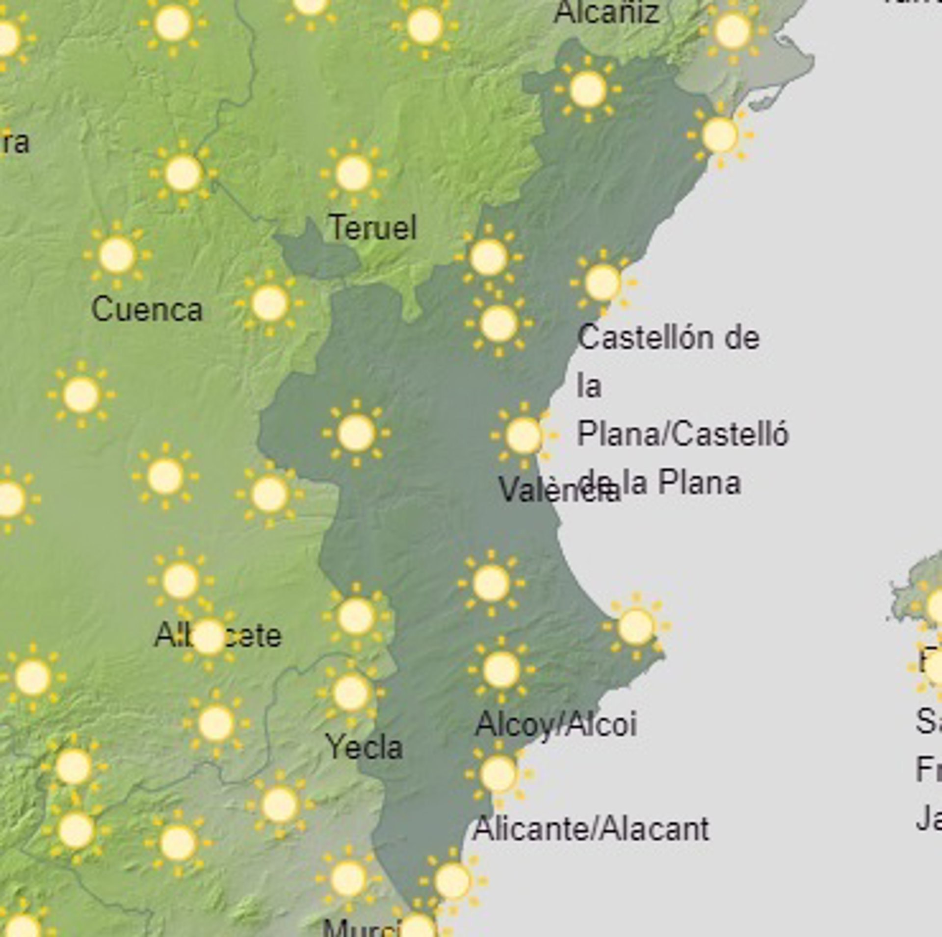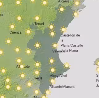 Así, en la provincia de Valencia, Ontinyent tendrá una máxima de 36 grados, mientras que Gandia alcanzará los 33 y Requena los 31 grados, al igual que la capital. En Alicante, Elx y Dénia llegarán a los 37 grados de máxima, mientras que en Alcoi la temperatura más alta será de 33 grados, como en la capital. El litoral sur de Alicante estará en aviso amarillo por fuertes temperaturas, ya que se podrán alcanzar los 37 C, así como en puntos del prelitoral sur de Valencia.