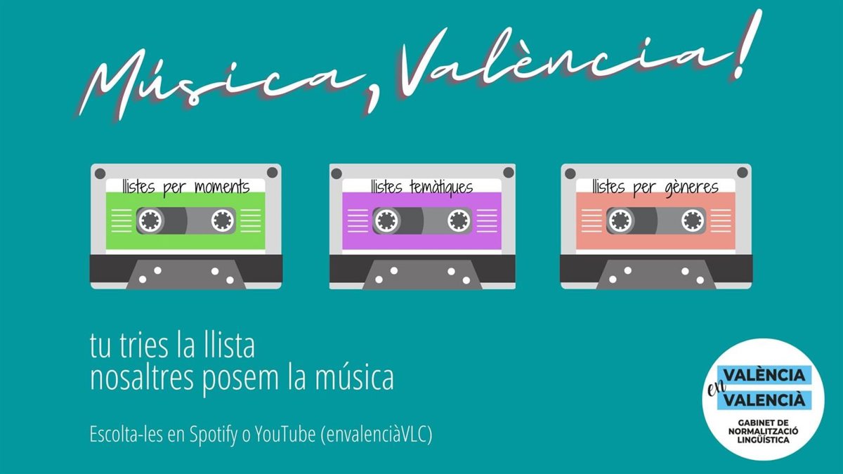 El Gabinete de Normalización Lingüística de la Ayuntamiento de Valncia ha elaborado la recopilación "más grande publicada hasta el momento" de listas de música en valenciano, con el objetivo de "fomentar y normalizar" el uso de la lengua por toda la ciudad. Bajo el nombre 'Música, Valncia!', el proyecto cuenta con tres tipos de recopilaciones: por géneros musicales, momentos y temática.
