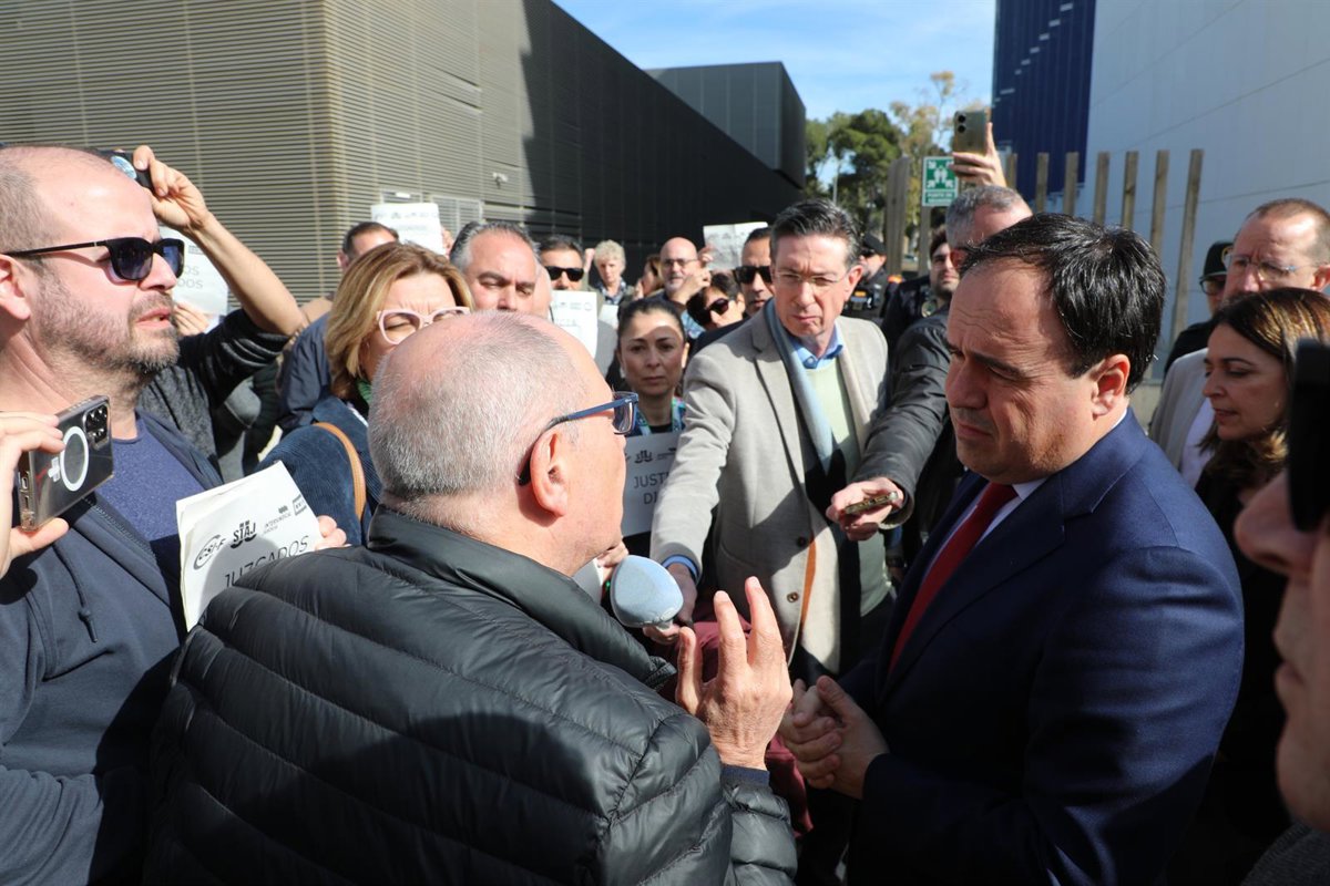 Llorca se ha dirigido a hablar con este grupo de funcionarios, que le esperaban en la puerta manifestándose por una mejora en las tablas retributivas y ante los cambios organizativos derivados de la implementación de los tribunales de instancia.