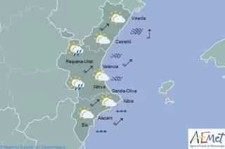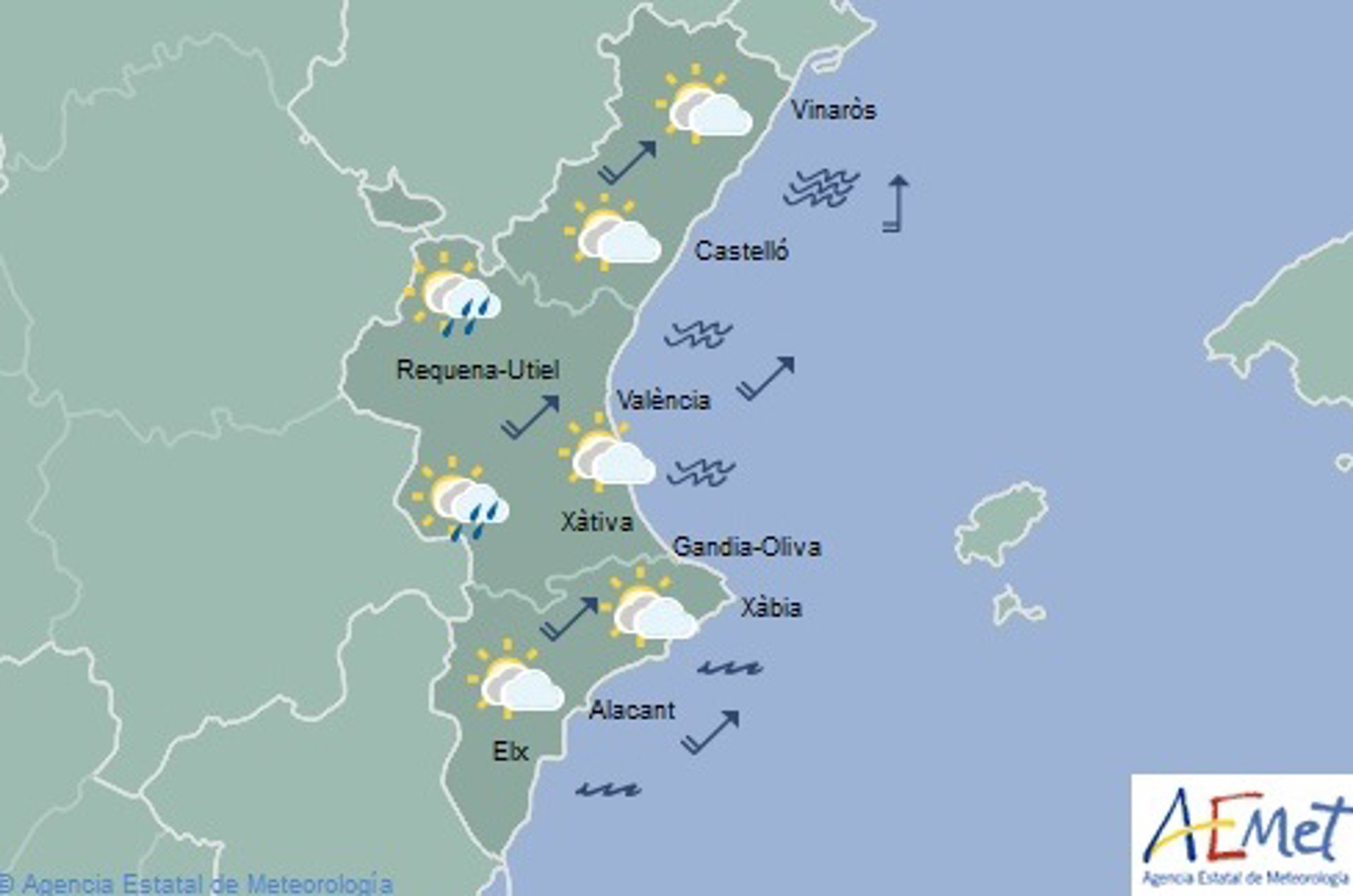 Por su parte, el viento soplará esta jornada del suroeste a oeste y suroeste moderado con rachas fuertes, especialmente en el interior de la Comunitat, según la predicción de la Aemet.