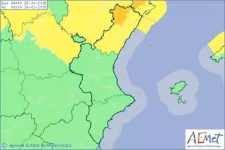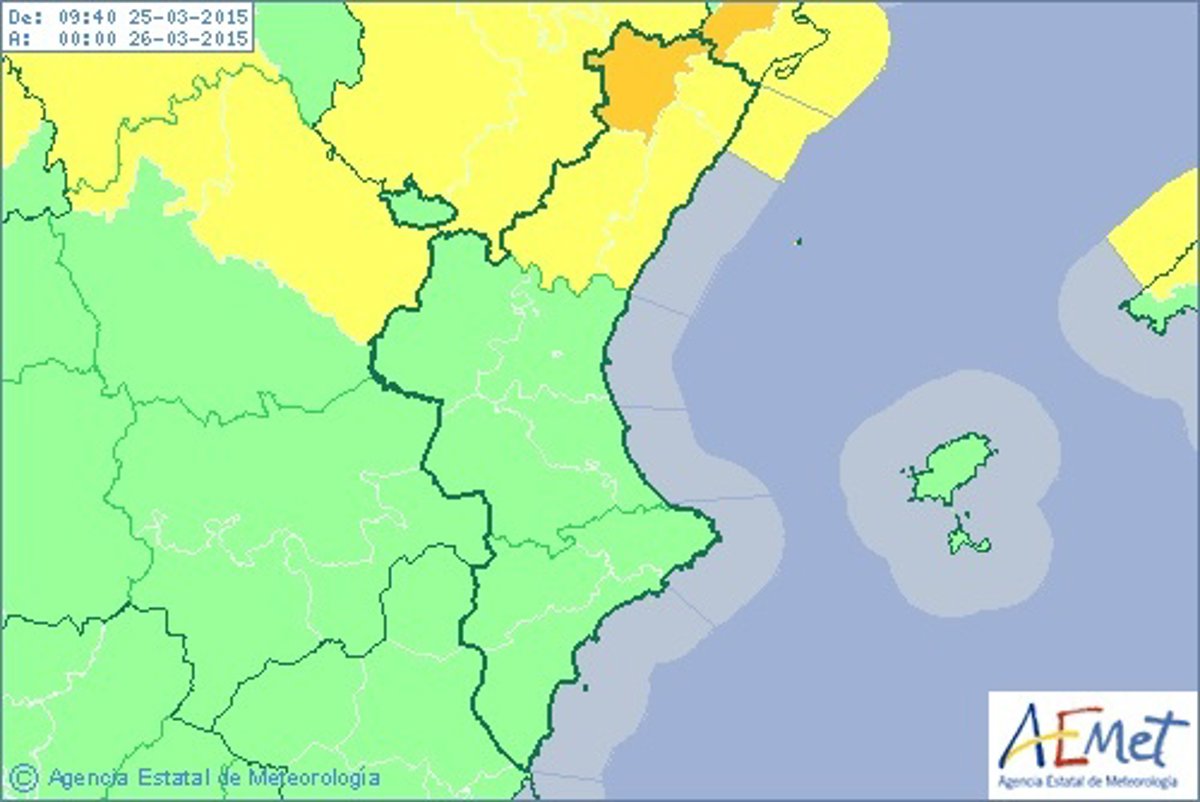 De este modo, el interior norte de Castellón está en alerta naranja, riesgo importante, y el resto en amarillo, riesgo, por vientos que pueden alcanzar rachas de 80-90 km/h.
