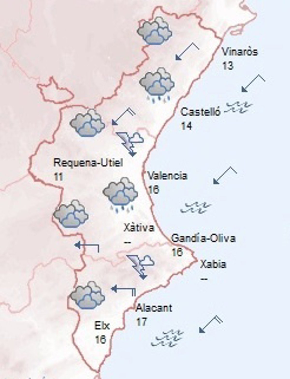 El litoral sur de Valencia y el norte de Alicante están en alerta amarilla por fuertes lluvias especialmente durante la primera mitad del día. De hecho, ya está lloviendo en la comarca valenciana de La Safor y en la alicantina de la Marina Alta, según Aemet.