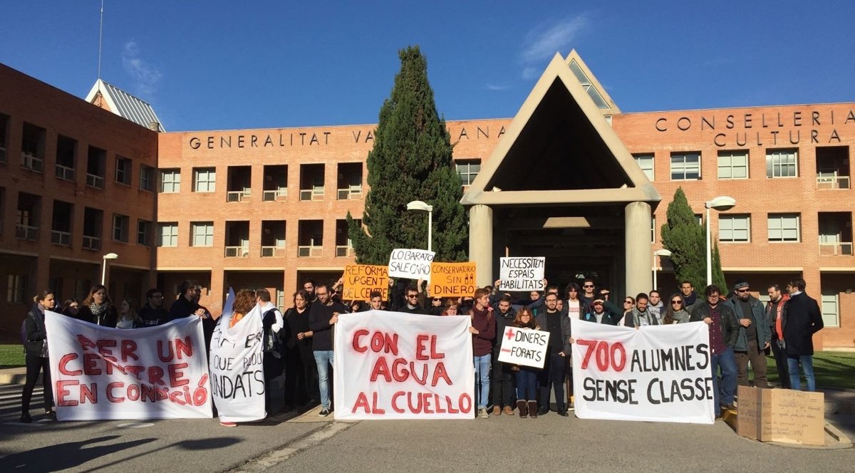 Una representación de los estudiantes se ha concentrado hoy ante la Conselleria de Educación para protestar por esta situación. Posteriormente, han sido recibidos por responsables del departamento que dirige Vicent Marzà, que se han comprometido a que las clases canceladas se retomen el próximo 5 de diciembre --siempre que no se vuelven a producir precipitaciones muy intensas- o a reubicar al alumnado en el cercano instituto Fuente de San Luis.