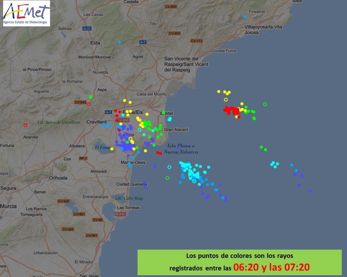 En la mañana de este jueves hay un núcleo de tormenta en el litoral de Alicante, en la zona de la Ribera, entre Carlet y Catadau y en el norte de Castellón, en el Baix Maestrat. Así, en el aeropuerto de Alicante-Elche se ha notificando chubasco fuerte de lluvia y visibilidad horizontal reducida a 3.700 metros y muchos rayos en la zona de Elx.