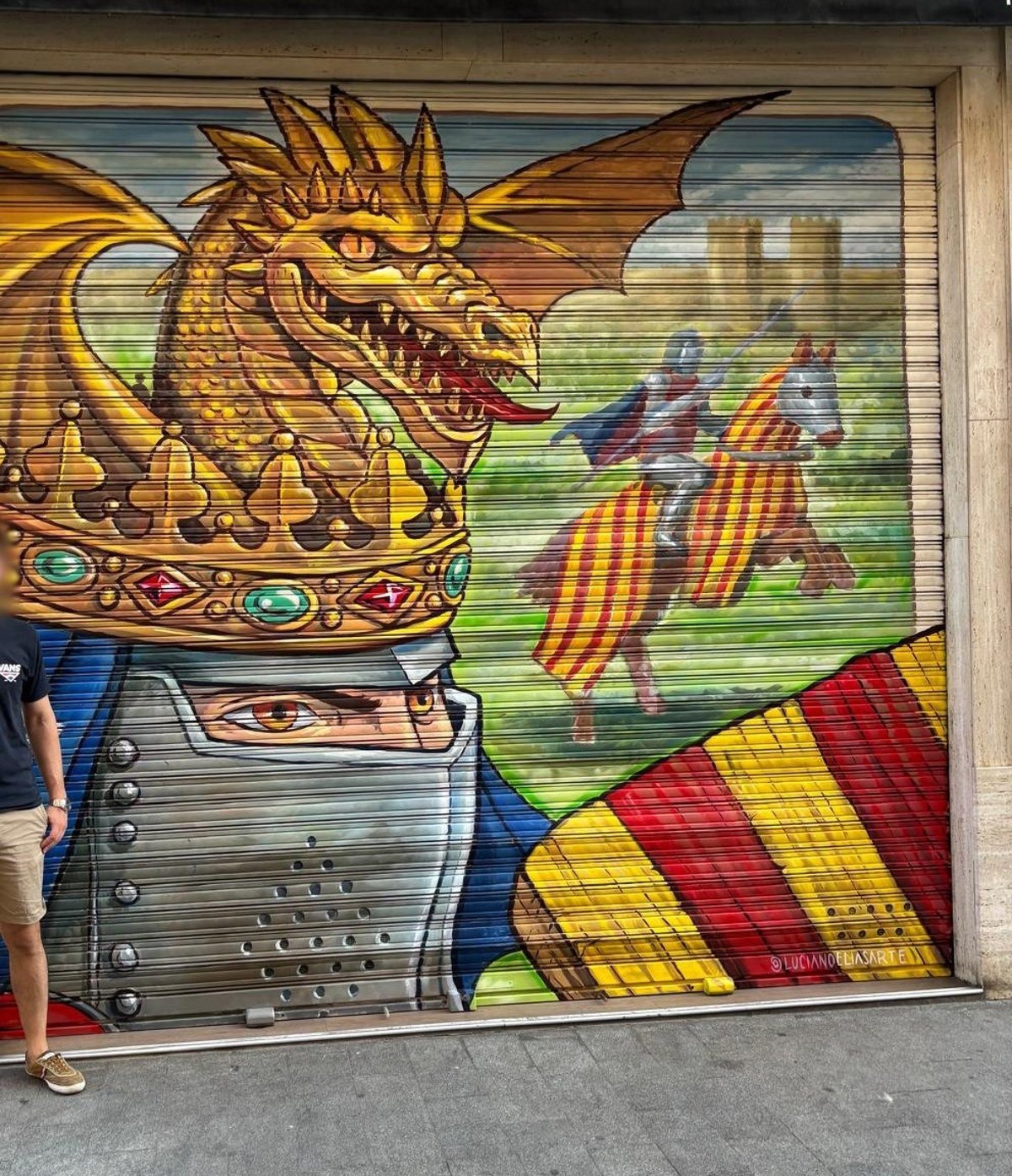 El artista Luciano Elías se ha proclamado ganador del concurso de arte urbano de Russafa con un mural de gran formato dedicado al rey Jaume I en la persiana del restaurante Torre de Utiel.