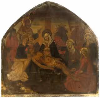 La restauración desvela ahora el cuerpo de Cristo con una cuidada anatomía, la Virgen, San Juan y el grupo de las tres Marías. En la obra también se representa a José de Arimatea con las llaves del sepulcro y a Nicodemo con las tenazas. Estos dos personajes fueron los que realizaron el descendimiento de la Cruz. Junto a ellos otros dos seguidores de Cristo que se identifican con áureas poligonales sostienen en sus manos un tarro de ungüentos y el sudario con el que se protegió el cuerpo de Cristo.