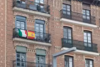 Balcón con las banderas de Italia y España, durante el primer día laborable de la segunda semana desde que se decretó el estado de alarma en el país a consecuencia del coronavirus, en Madrid (España), a 23 de marzo de 2020. - Joaquin Corchero / Europa Press