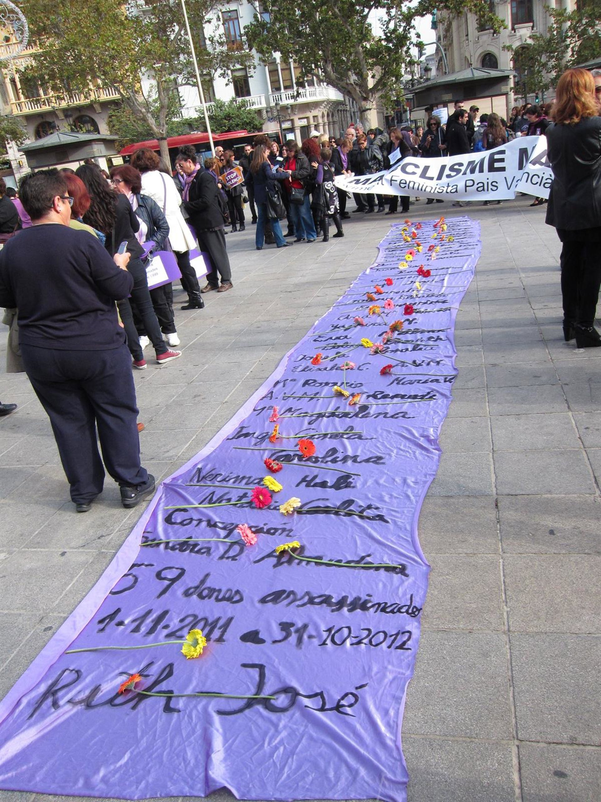 Allí ha tenido lugar un emotivo homenaje a las 43 muertes como consecuencia de la violencia de género en lo que va de año, de las que seis se han producido en la Comunitat Valenciana. Todos los asistentes han formado un enorme círculo en cuyo interior han desplegado una larga tela morada con todos los nombres de las víctimas mortales escritos en ella, muchos de ellos anónimos.