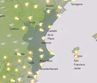 Las temperaturas máximas de la ciudad de Alicante y Castelló se sitúan en 19C, con mínimas de 11 y 9C, respectivamente. En Valncia, los termómetros alcanzarán los 21C y no bajarán de 11C.