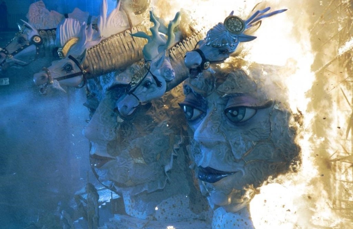 En la hoguera de Calvo Sotelo se quemó la parte superior de la lona que protegió el ficus durante toda la Cremá, mientras e la de Hernán Cortés parte de la estructura se quedó en pie y los bomberos tuvieron que intervenir con el vehículo escalera para tirarlo y finalizar la Cremà.