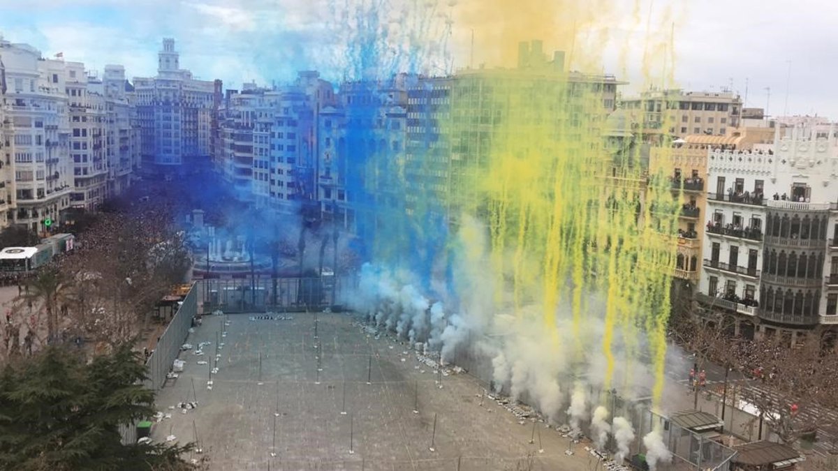 Tras este silencio en la plaza, y con 110 kilos de pólvora, el espectáculo ha comenzado con humo de color azul y amarillo, una parte que no estaba prevista en la propuesta inicial, pero que desde Tamarit han querido incluir para "dar una sorpresa" en homenaje a Ucrania, ha destacado uno de los socios de la pirotecnia, Vicente Carsí, tras el disparo.