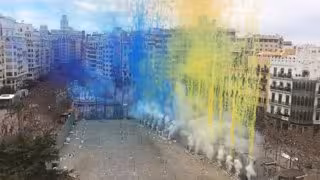 La 'mascletá' de este sábado, 5 de marzo, a cargo de la pirotecnia valenciana Tamarit, de Alfarrasí, ha teñido la plaza del Ayuntamiento de los colores de la bandera ucraniana en solidaridad con este país y repulsa a la invasión rusa, en un "emotivo" y "dinámico" espectáculo precedido por un minuto de silencio.
