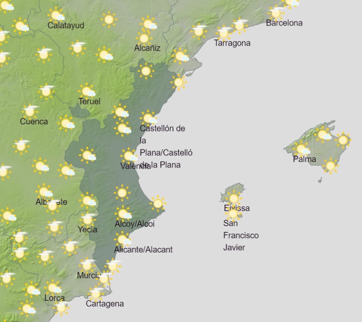 Según la predicción de la Agencia Estatal de Meteorología (Aemet), las temperaturas se alejarán de los 30 grados del viernes y sábado y se quedarán en el entorno de los 25. Tan solo en Orihuela se alcanzarán 30 grados.