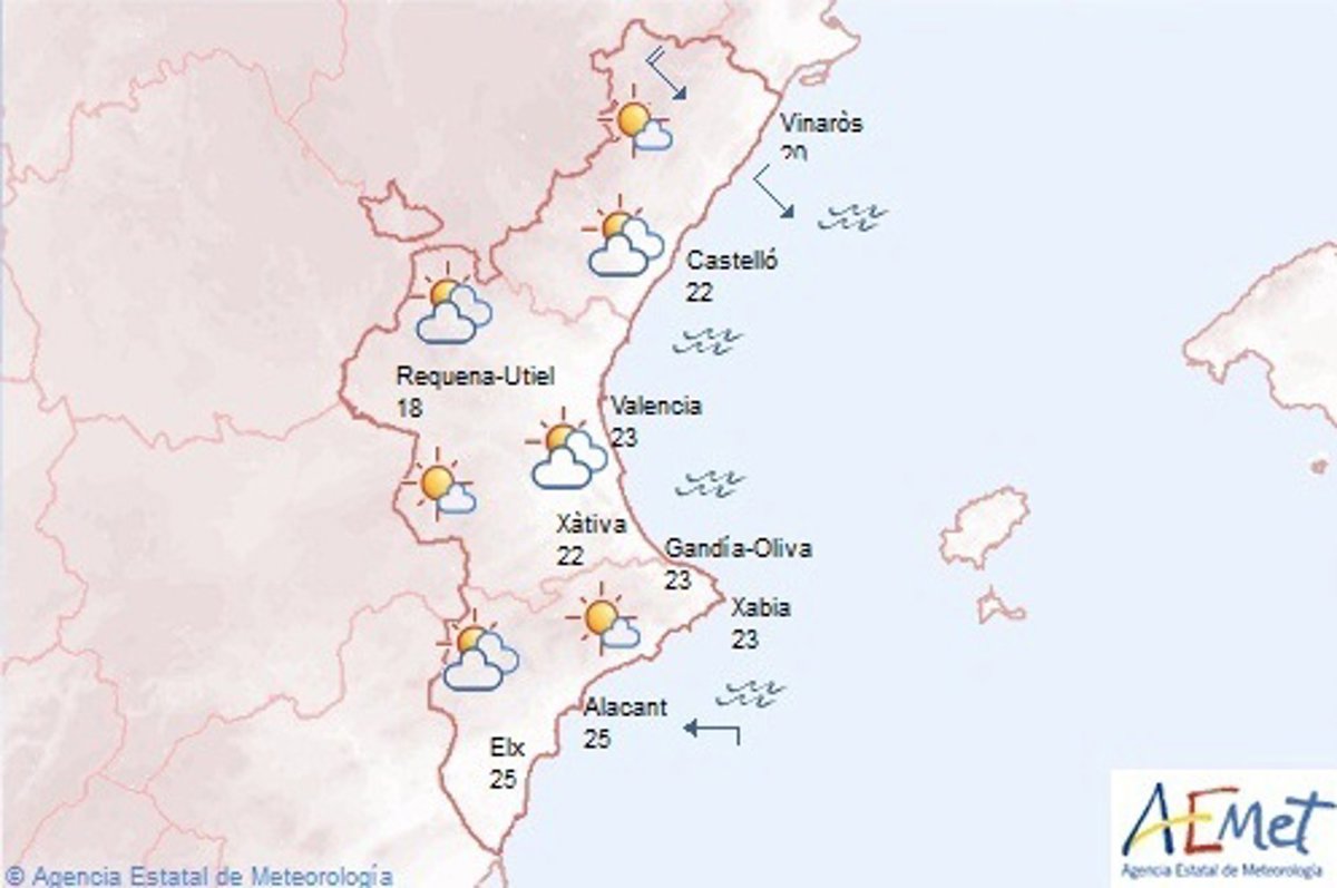 El viento soplará variable flojo salvo intervalos de noroeste moderado al principio en el extremo norte de Castellón y tenderá al mediodía a componente sur en Alicante y a componente este en el resto.