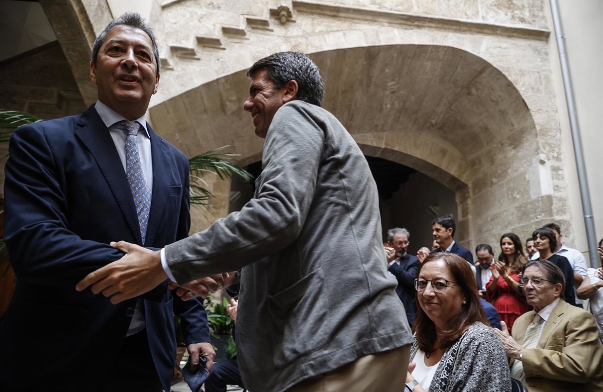 Archivo - El nuevo vicepresidente primero y conseller de Cultura y Deporte de la Generalitat, Vicente Barrera (i) y el presidente de la Generalitat valenciana, Carlos Mazón (d), durante el traspaso de la cartera - Rober Solsona - Europa Press - Archivo