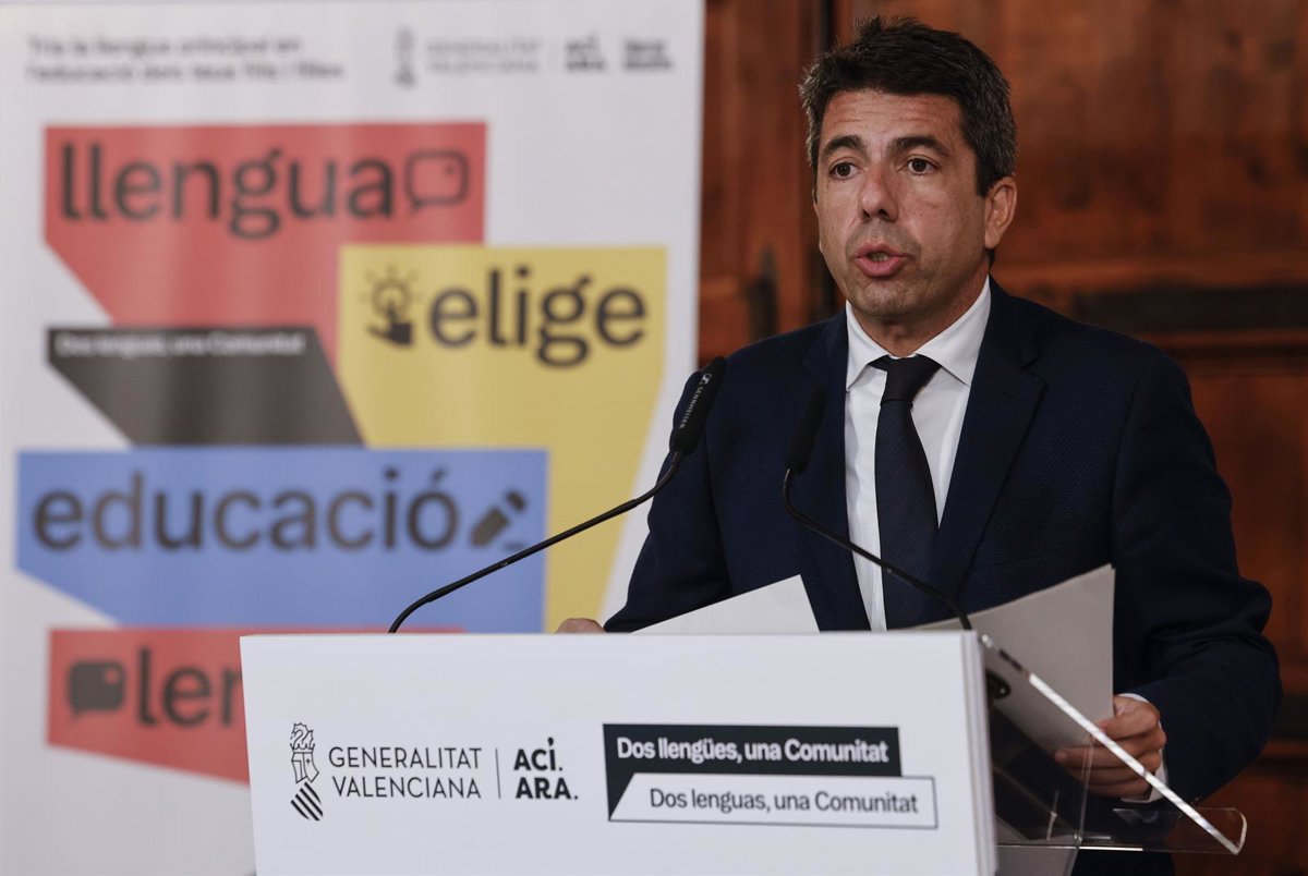El presidente de la Generalitat valenciana, Carlos Mazón, interviene durante la presentación de la campaña sobre la elección de la lengua base en los centros educativos (archivo) - Rober Solsona - Europa Press