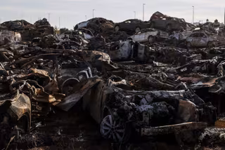 Imágenes de los vehículos calcinados en el incendio en la campa habilitada en Catarroja para recogerlos tras el paso de la dana - ROBER SOLSONA/EUROPA PRESS