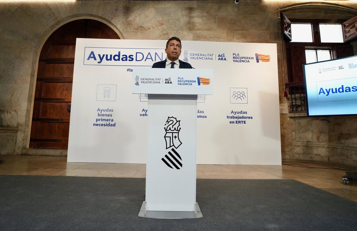 El 'president' de la Generalitat, Carlos Mazón, ha anunciado que el pleno del Consell del próximo viernes aprobará varios decretos con nuevas ayudas "automáticas y sin burocracia" para familias, propietarios de vehículos, autónomos y trabajadores en ERTE afectados por la dana del 29 de octubre que suman un total de 350 millones de euros, con la intención de que empiecen a abonarse este mismo mes.