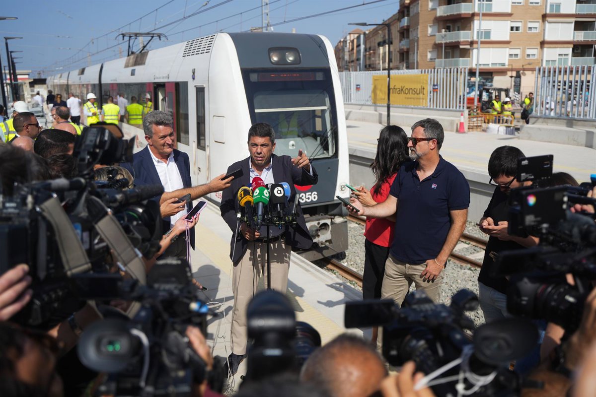 El presidente de la Generalitat, Carlos Mazón, atiende a los medios tras un recorrido en pruebas previo a la reapertura del tramo València Sud-Castelló de Metrovalencia. - EUROPA PRESS - JORGE GIL
