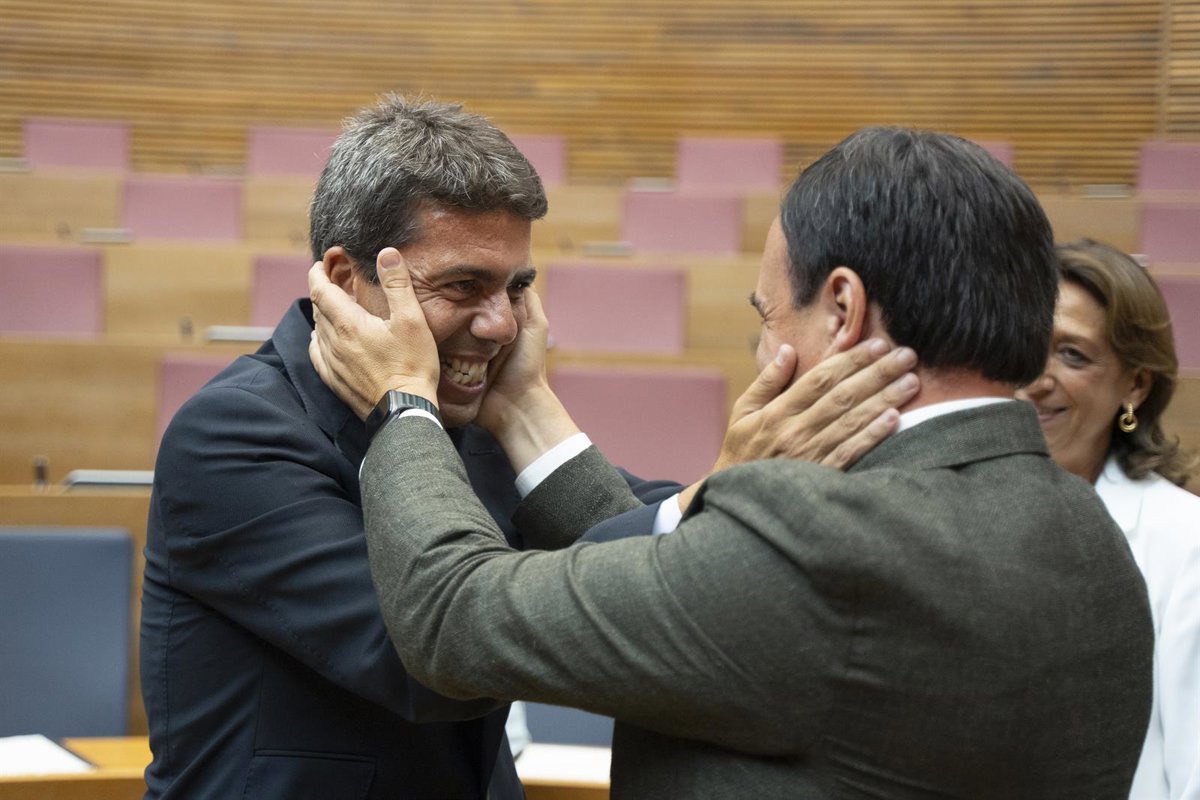 Archivo - Imagen de archivo del presidente en funciones de la Generalitat, Carlos Mazón (i), con el actual síndic del PP en Les Corts, Juan Francisco Pérez Llorca (d), tras el pleno de investidura en las Corts Valencianes, a 13 de julio de 2023. - Jorge Gil - Europa Press - Archivo