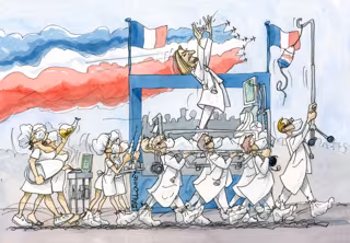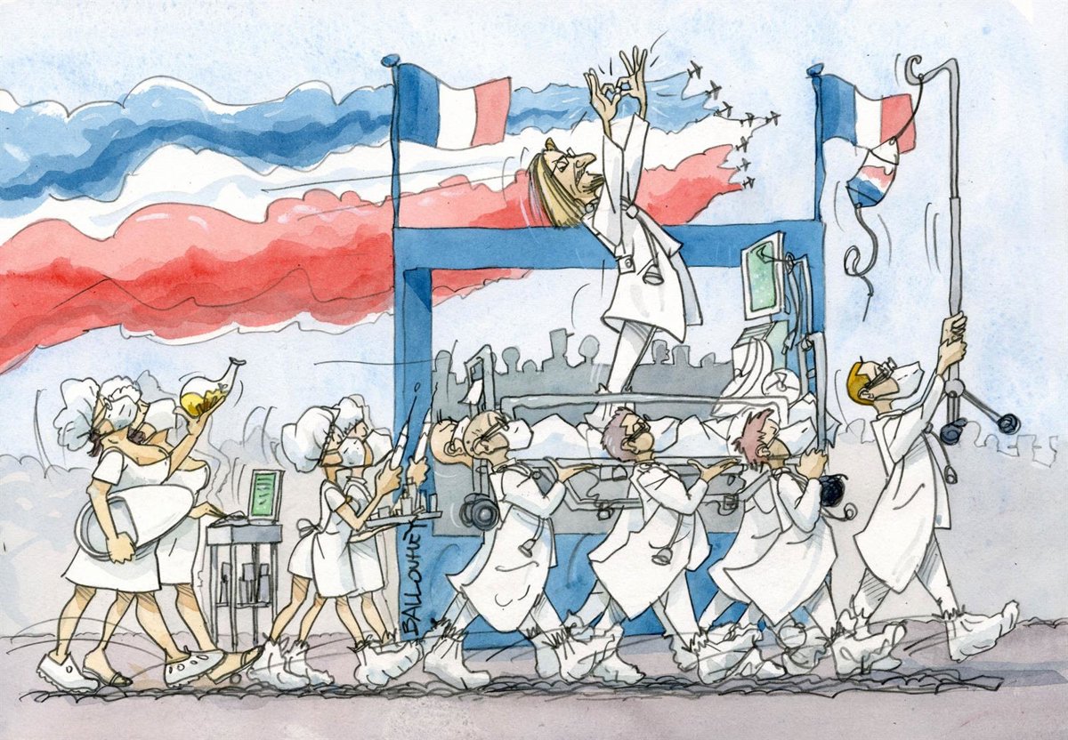 En las viñetas analizadas no sólo aparecen menos mujeres que hombres representando las profesiones sanitarias, sino que éstas tienen un rol estereotipado. En la viñeta, un grupo de enfermeras vestidas con minifalda y escote escolta a los médicos. - UV
