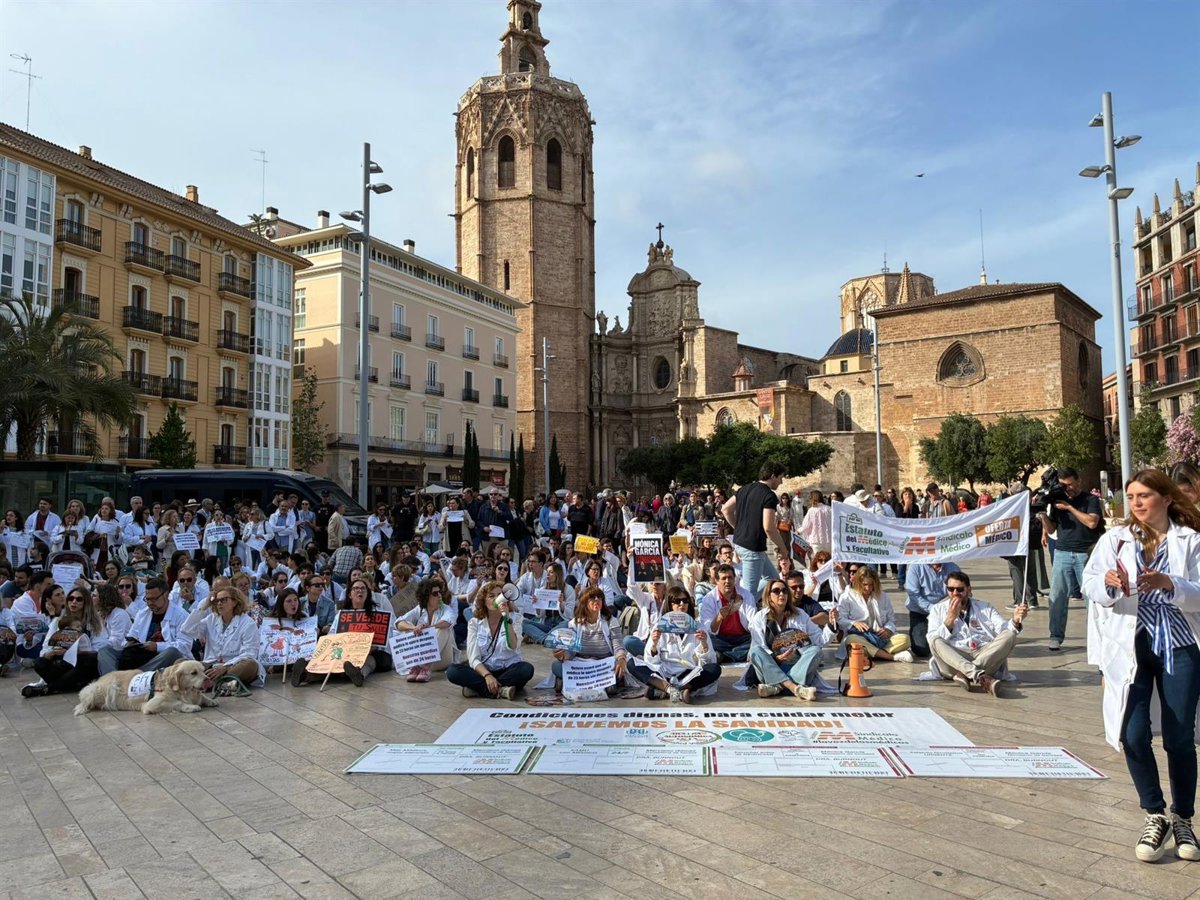Los médicos valencianos, convocados por el CESM CV, han celebrado este miércoles en la plaza de la Reina de València una nueva concentración en forma de sentada, seguida de una manifestación, para exigir un Estatuto Marco propio y condiciones laborales "como todos los mortales".