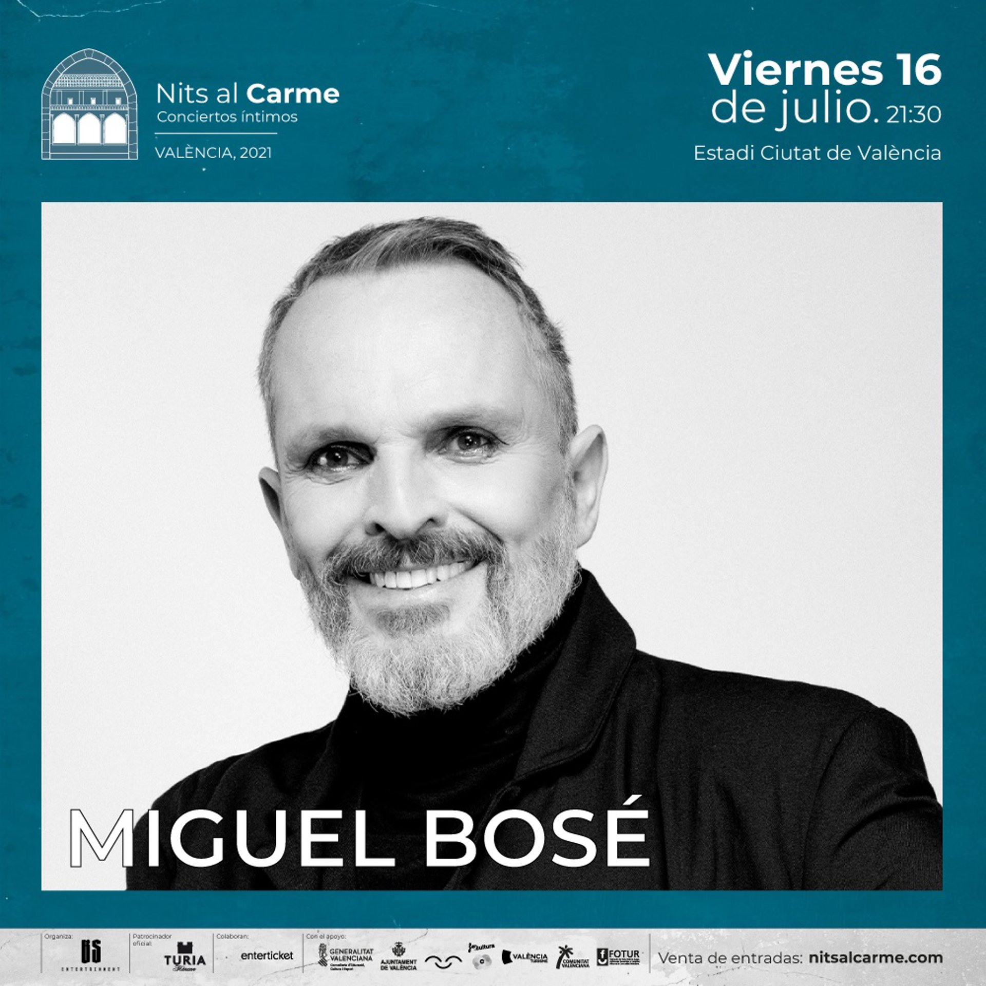 Miguel Bosé actuará el viernes 16 de julio en Valncia, en un recinto por confirmar dentro del ciclo Nits al Carme, tras cuatro años desde su última visita a la ciudad. Será el primero de los tres únicos conciertos que tiene programados para 2021.