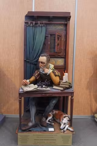 En homenaje al autor de 'El Quijote', el ninot muestra a un Miguel de Cervantes en proceso de creación con un pequeño cuaderno del que emanan sus dos personajes más universales, Don Quijote y Sancho, y acompañado de un perro. Este año la falla grande de la comisión tiene como lema 'Nos cambiaron el cuento'.