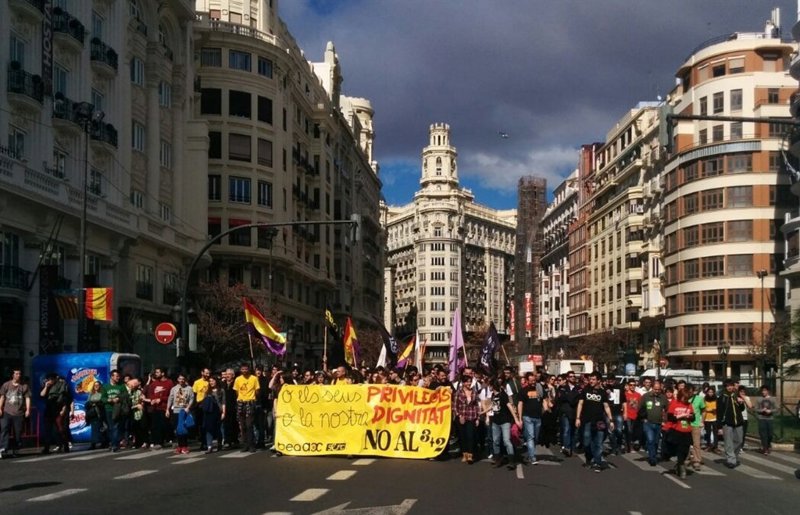 La marcha, que ha arrancado a las 12.00 horas desde la Facultad de Historia de la Universitat de València, ha aunado dos convocatorias, una liderada por la coordinadora Estudiantil de Valencia --que integran el Bloc d'Estudiants Agermanants (BEA), Acontracorrent y el Sindicat d'Estudiants de Països Catalans (SEPC)-- y otra por el Sindicat d'Estudiants.