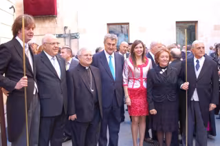 Posada ha saludado a los cantores y personalidades de la Festa, ha presenciado el La Vespra y, acompañado por la alcaldesa y miembros de la corporación municipal, ha participado en la procesión que recorre las calles de Elche.