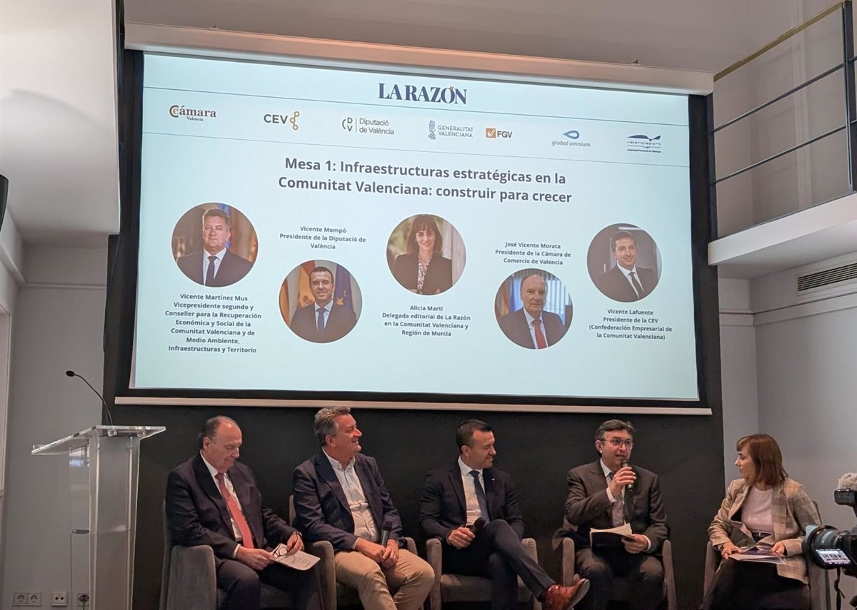 Así lo han manifestado en la mesa de debate 'Infraestructuras estratégicas en la Comunitat Valenciana: construir para crecer', en un foro organizado por el diario La Razón, en el que han participado, junto a Lafuente y Morata, el vicepresidente tercero y conseller de Medio Ambiente, Infraestructuras, Territorio y Recuperación, Vicente Martínez Mus, y el presidente de la Diputació, Vicent Mompó.