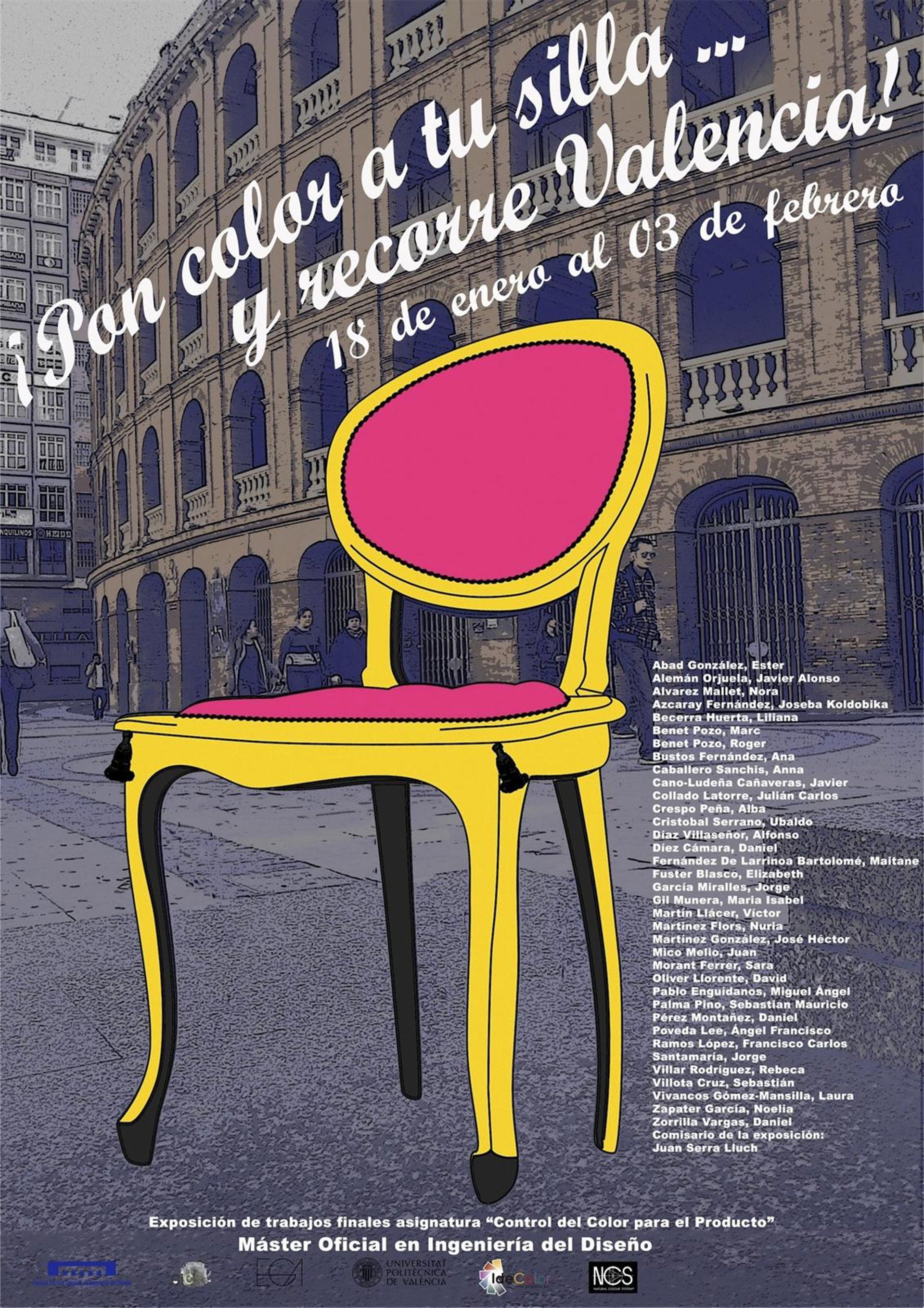Estudiantes del Máster en Ingeniería del Diseño de la Universitat Politècnica de València (UPV) exponen desde este viernes en la sala de la Junta Municipal de Ciutat Vella 36 de sus obras en una muestra en la que reiventan colores nuevos para lugares conocidos de Valencia. La exposición 'Colorea tu silla y recorre Valencia' reúne los trabajos finales de una de las asignaturas cursadas, según ha informado la institución académica en un comunicado.