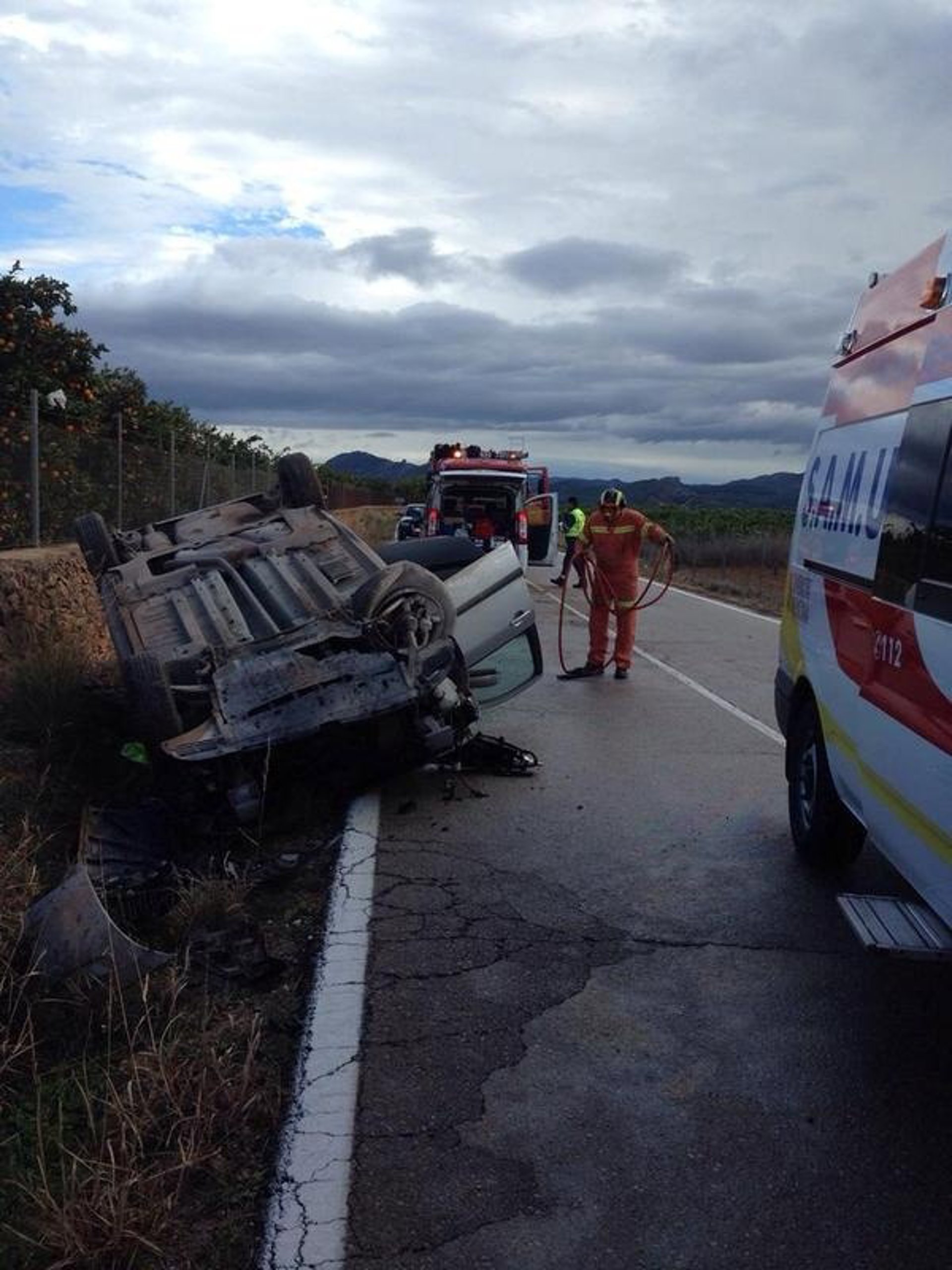 El siniestro se ha producido en torno a las 9.30 horas a la altura de la finca Ferri y el vehículo ha quedado volcado en la calzada. Bomberos de Xàtiva, Alzira y Ontinyet han liberado a la mujer, que ha sido atendida in situ por los médicos del SAMU.