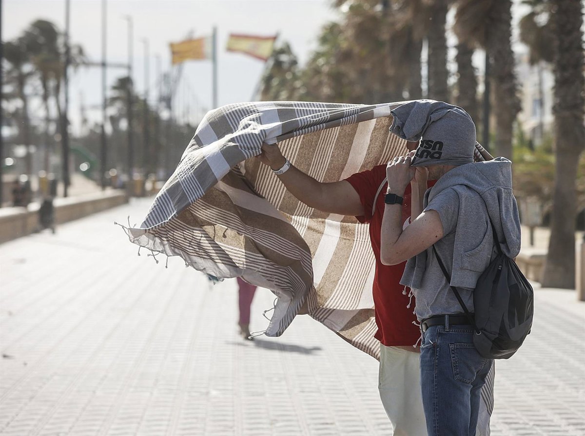 Archivo - Dos personas se refugian del viento en el paseo de la playa de la Malvarrosa - Rober Solsona - Europa Press - Archivo