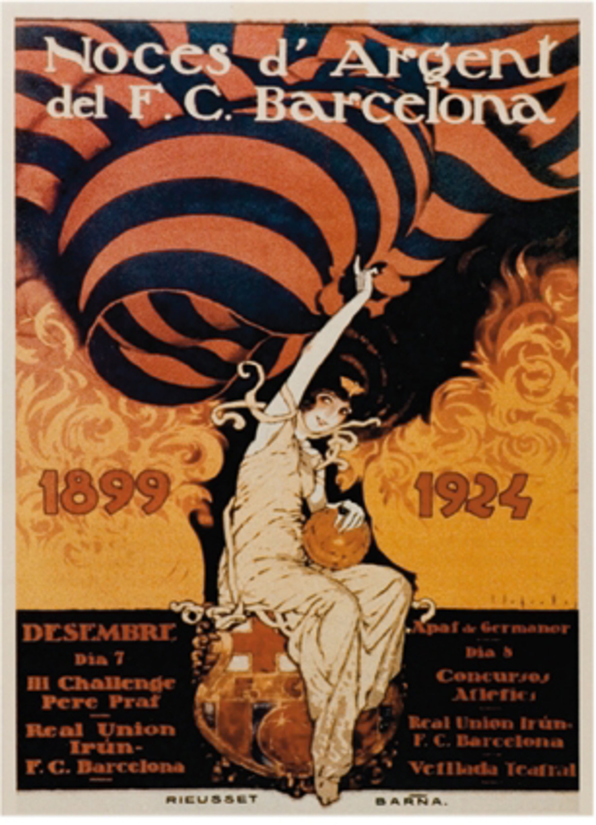 Así, José Segrelles confeccionó el Cartel de las Bodas de Plata del Barça en el año 1924. La vinculación al fútbol del autor le hizo inscribirse como socio del F.C. Barcelona y fue nombrado cartelista oficial tal y como figuraría en la orla corporativa 'Llibre d'Or del Fútbol Català', editado en el año 1928. Segrelles continuaría durante su dilatada carrera artística compaginando a la vez los carteles con su trabajo como ilustrador.
