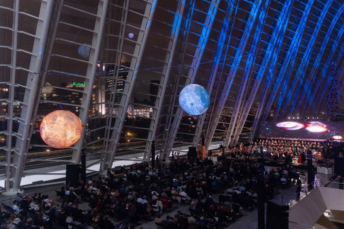 El acto se ha desarrollado en la Calle Mayor del Museu de les Ciències y ha contado con una orquesta sinfónica de 50 músicos y un coro de 80 voces, con piezas inspiradas en el espacio, a la vez que se han proyectado imágenes del espacio, como un viaje desde el sistema solar al campo profundo, mostrando la inmensidad.