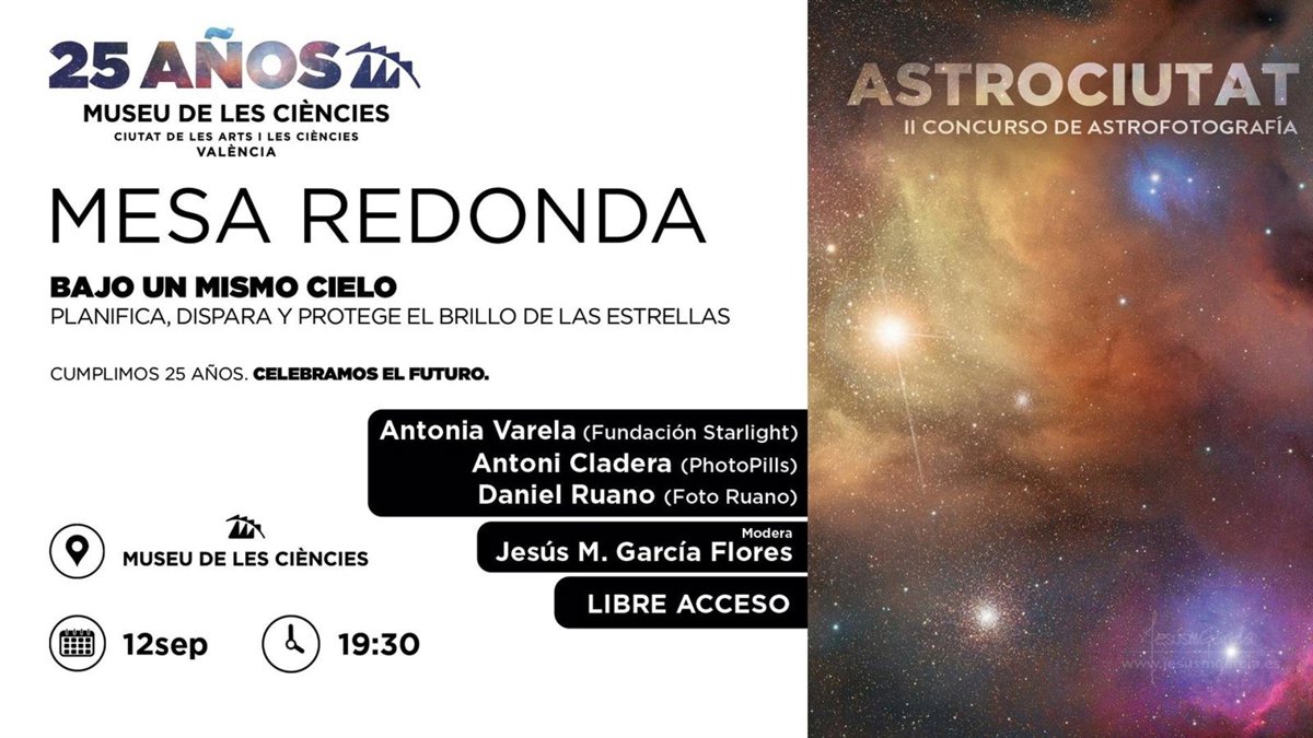 El evento arrancará a partir de las 19.30 horas, con la mesa redonda 'Bajo un mismo cielo. Planifica, dispara y protege el brillo de las estrellas', en el Auditorio Santiago Grisolía del Museu de les Ciències. Se trata de una actividad de libre acceso hasta completar aforo.