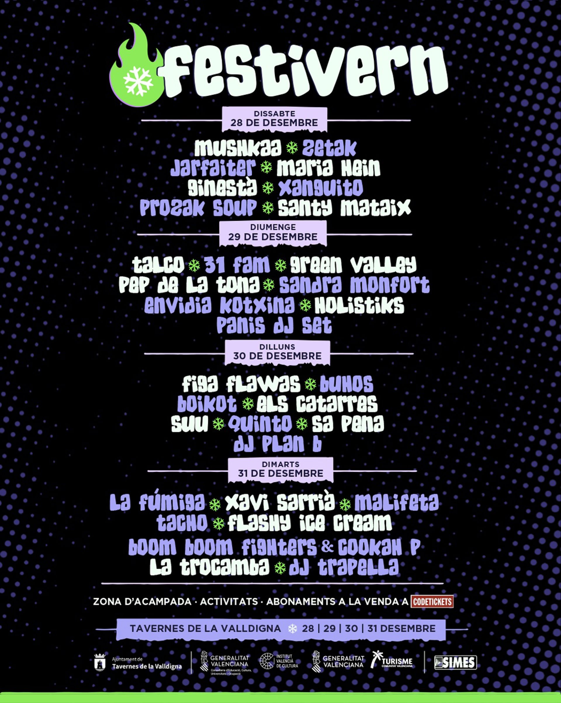 Mushkaa, Zetak, Jarfaiter, Maria Hein, Ginestà, Xanguito, Prozak Soup y Santy Mataix serán los artistas encargados de inaugurar la 20º edición del Festivern, que se celebrará del 28 al 31 de diciembre en la localidad valenciana de Tavernes de la Valldigna.