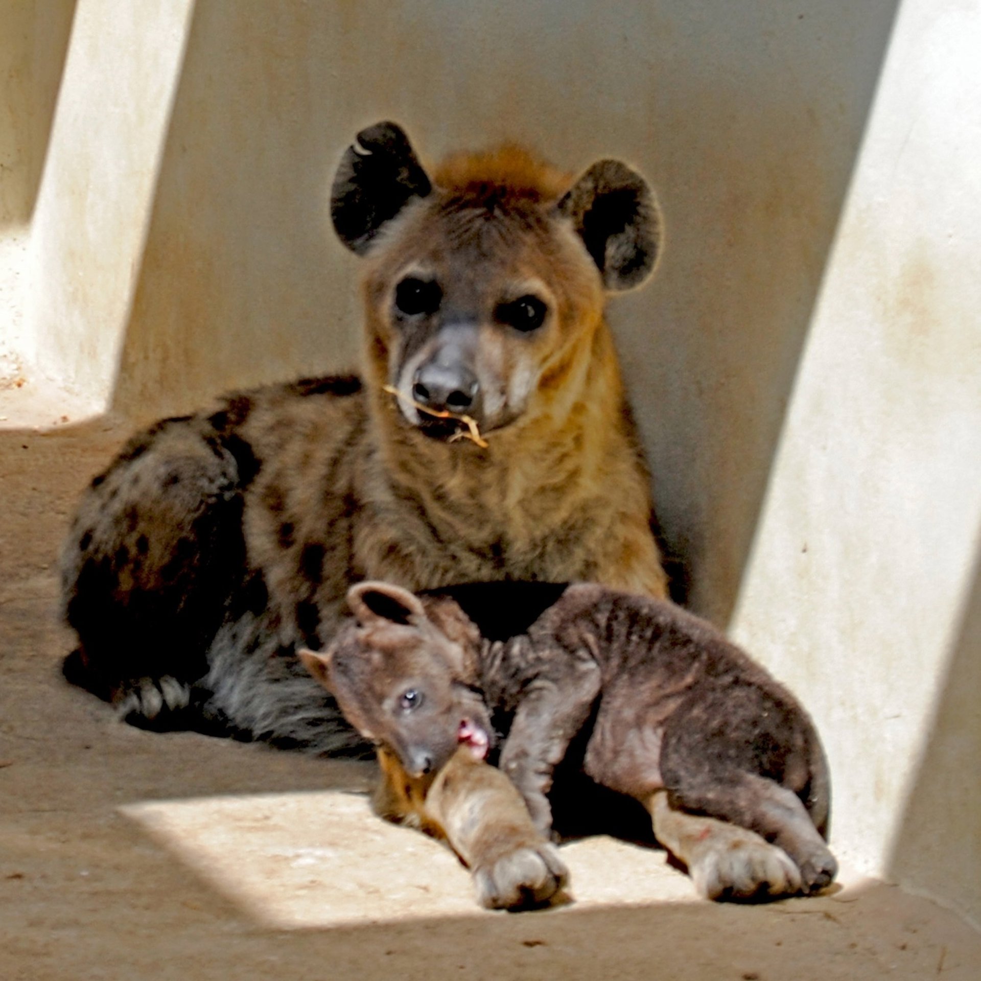 Los padres de la cría pertenecen a la especie Crocuta crocuta. Las hembras son el sexo dominante en esta especie. Son de mayor tamaño que los machos y será la hembra alfa la que lidere el clan. Este rango social es heredado por sus crías. Tienen camadas cada año y medio, compuestas de uno a cuatro cachorros, que nacen con dientes y con los sentidos de la vista, el oído y el olfato bien desarrollados.