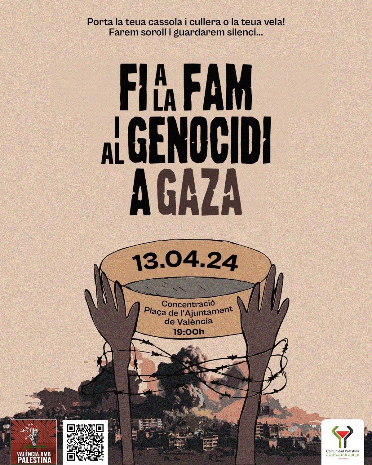 Paralelamente, la plataforma dará apoyo a las actividades afines que se organicen en el territorio como la concentración impulsada por la Comunidad Palestina en Valencia que, bajo el lema 'Fin a la hambruna y al genocidio en Gaza', tendrá lugar a las 19 horas del próximo sábado 13 en la plaza del Ayuntamiento de València.