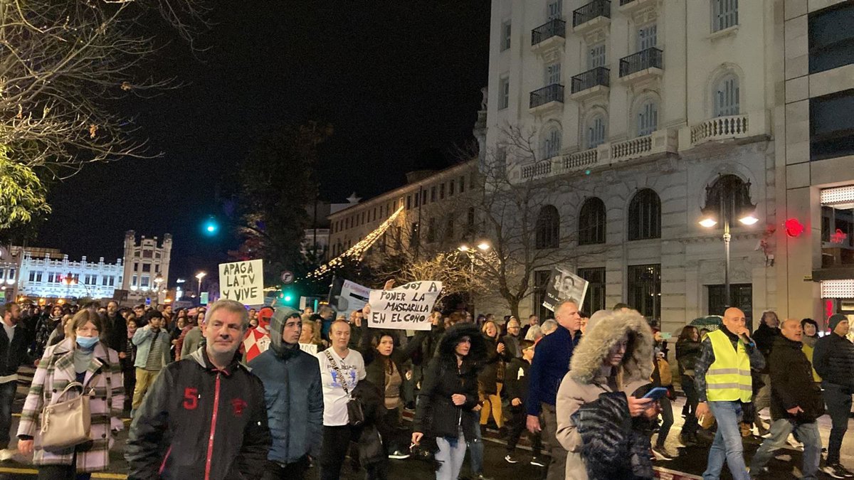 La protesta ha arrancado a las 18.00 horas en la plaza del Ayuntamiento y ha marchado por la calle de las Barcas, Colón, Xtiva y Marqués de Sotelo, entre otras, convocada por las organizaciones Triple V, Unión Activa Valencia, Policías por la Libertad y Familias x la verdad.