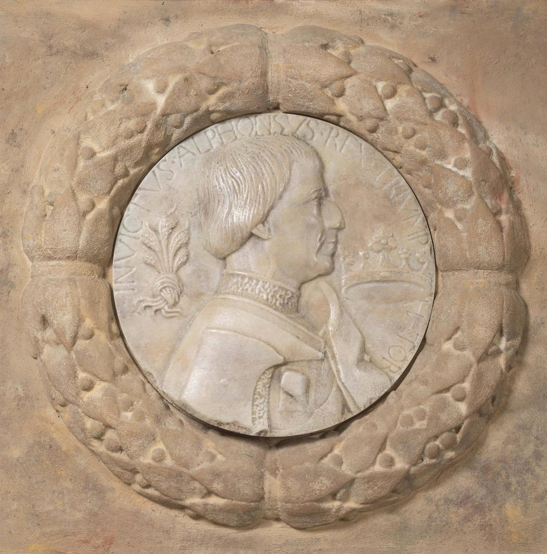 Se trata de una copia escaneada reproducida por control numérico computerizado en materiales sintéticos, aumentada un 18% respecto a la obra original y completada con una guirnalda coetánea. La pieza muestra al rey Alfons el Magnànim vestido con armadura de guerra, milanesa, sin coraza, mirando a la derecha, en dirección a una corona real.