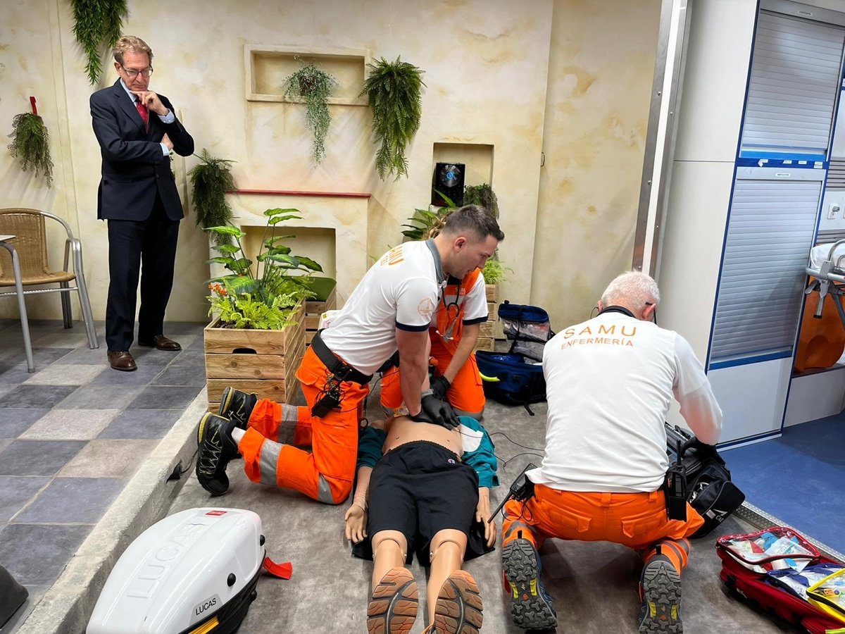 Precisamente, en su visita, el conseller de Sanidad ha presenciado la simulación de una parada cardíaca en vía pública, cuya asistencia ha sido realizada por un equipo del SAMU (Servicio de Ayuda Médica Urgente), formado por médica, enfermera y técnico en emergencias sanitarias.