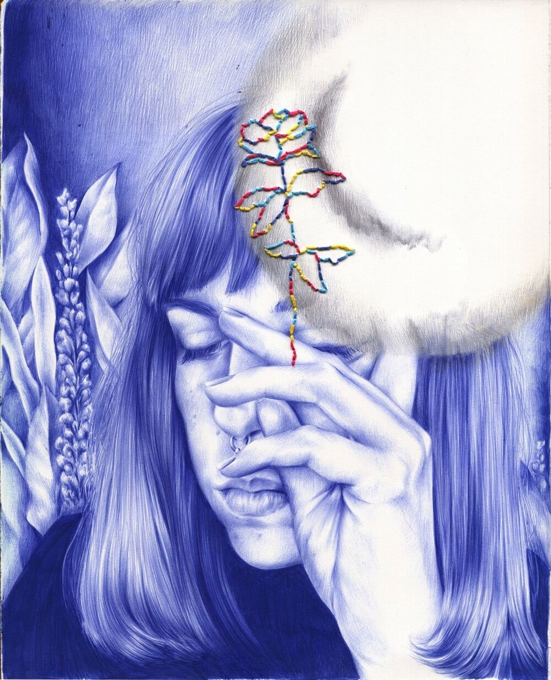 Figuras circulares y distorsionadas, como las ondas químicas que se mueven a través de la corteza del cerebro; auras pintadas que expanden el acrílico y convierten los objetos en líneas en zigzag; la tinta del bolígrafo BIC que funde el azul y el negro en las zonas de sombra y las vuelve escotomas; y los hilos de algodón de tonos primarios intensos, que se hacen fuertes frente al papel como una alucinación, son los elementos que retratan la realidad impresa en la obra de Nuria Riaza, concluye.