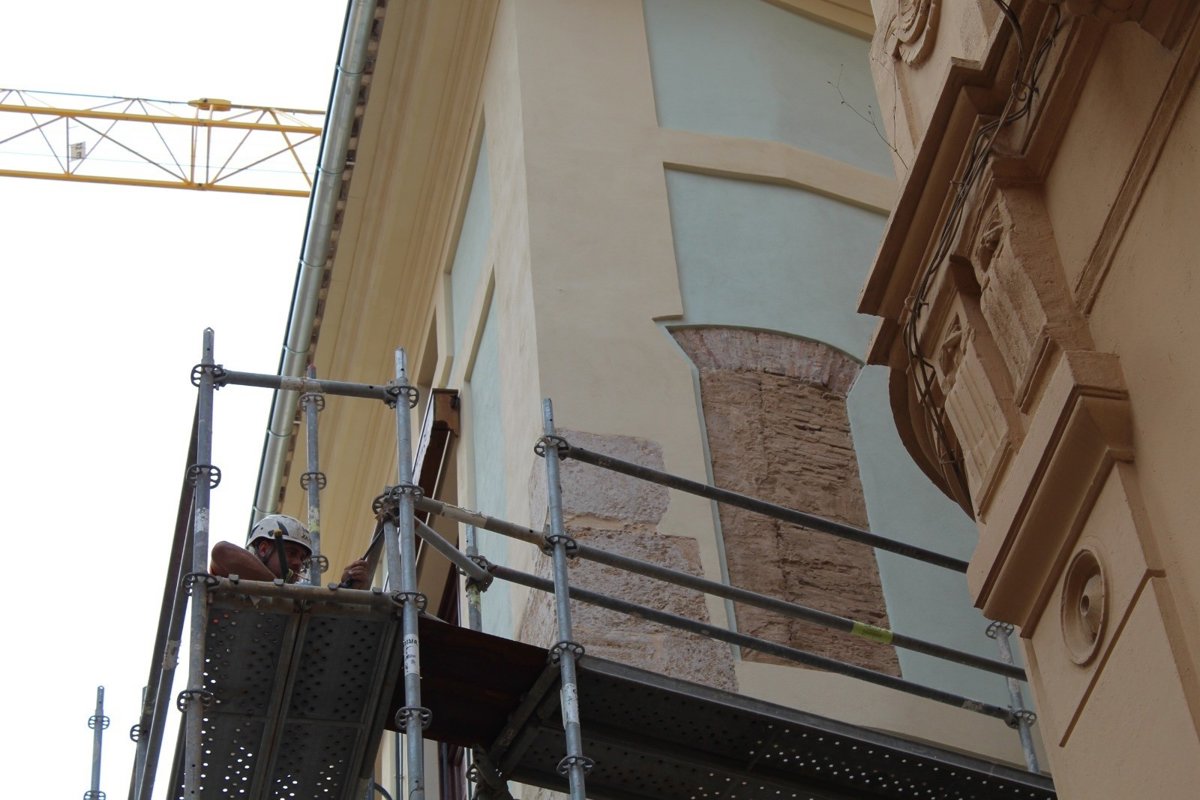 Los trabajos de recuperación de la Casa del Relojero de Valncia se encuentran "muy avanzados" y esta semana se está retirando el andamio de su fachada, donde ya se ven tanto los elementos ornamentales y colores como el principal hallazgo que han traído las obras: un arco de finales del siglo XVIII que se instaló en previsión de erguir un puente para comunicar el edificio con la Catedral, un proyecto que nunca llegó a realizarse.