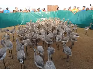 Para ello, los expertos y voluntarios cercan a los animales, dirigiéndolos hasta un área seca. En este transcurso los ejemplares adultos sanos alzan el vuelo y se quedan en el corral de tierra firme únicamente los animales enfermos y juveniles, que presentan un color grisáceo veteado por las alas.