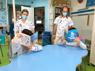 Docentes en el hospital junto a dos pacientes leyendo Ona la Tiburona y el comic de Medusas - OCEANOGRFIC