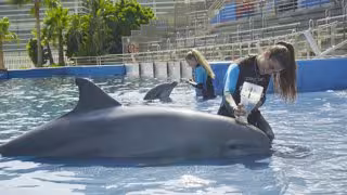 Una de las cuidadoras con un delfín en el delfinario del Oceanogrfic - OCEANOGRFIC