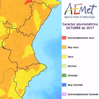 Por zonas, el último octubre ha sido muy seco en la mayoría de la Comunitat Valenciana, hasta el 68% del territorio --casi toda la provincia de Valencia y Castellón-- y seco en el 31%, gran parte en Alicante. Solo el 1% de la región ha tenido un carácter climático normal, en zonas del litoral norte alicantino.